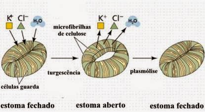 Os estômatos se abrem quando as células-guarda se apresentam mais túrgidas que as células circundantes, e se fecham quando as células-guarda se encontram menos túrgidas. A turgência é mantida ou perdida devido ao movimento osmótico passivo da água para dentro e para fora das células ao longo de um gradiente de concentração de solutos que é estabelecido ativamente.